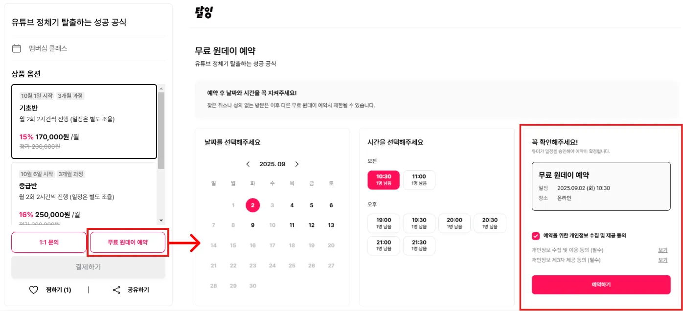 멤버십 클래스 정규 과정 신청 전 무료 체험(원데이클래스)을 진행하여 예비 수강생님들을 만나볼 수 있어요!