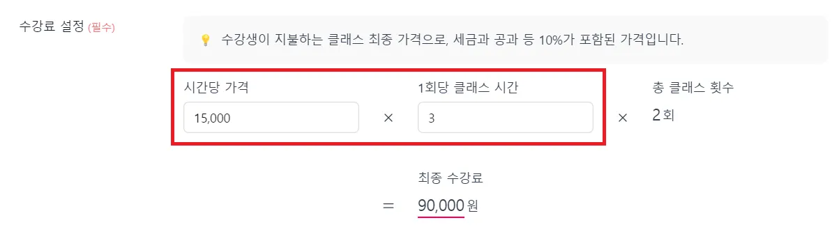 기재해주시는 가격은 수강생이 결제하는 금액과 동일하니 공급가에서 세금과 공과 등 10%가 포함된 총 금액으로 기입해주세요.