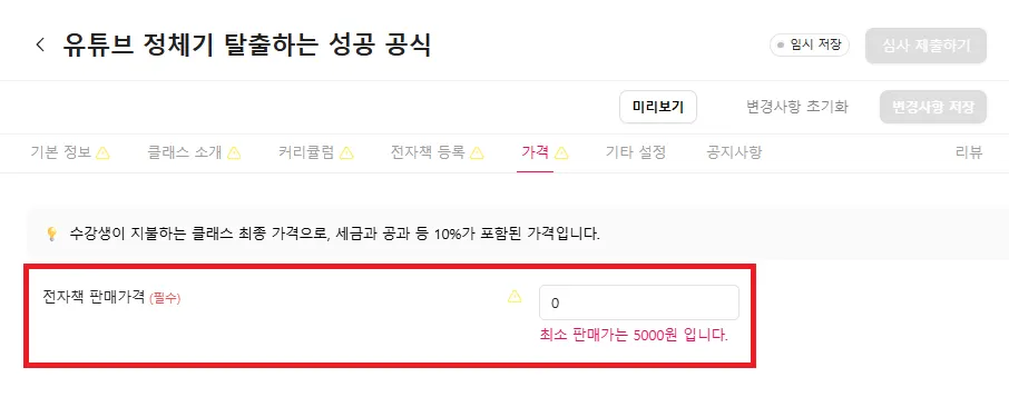 기재해주시는 가격은 수강생이 결제하는 금액과 동일하니 공급가에서 세금과 공과 등 10%가 포함된 총 금액으로 기입해주세요.